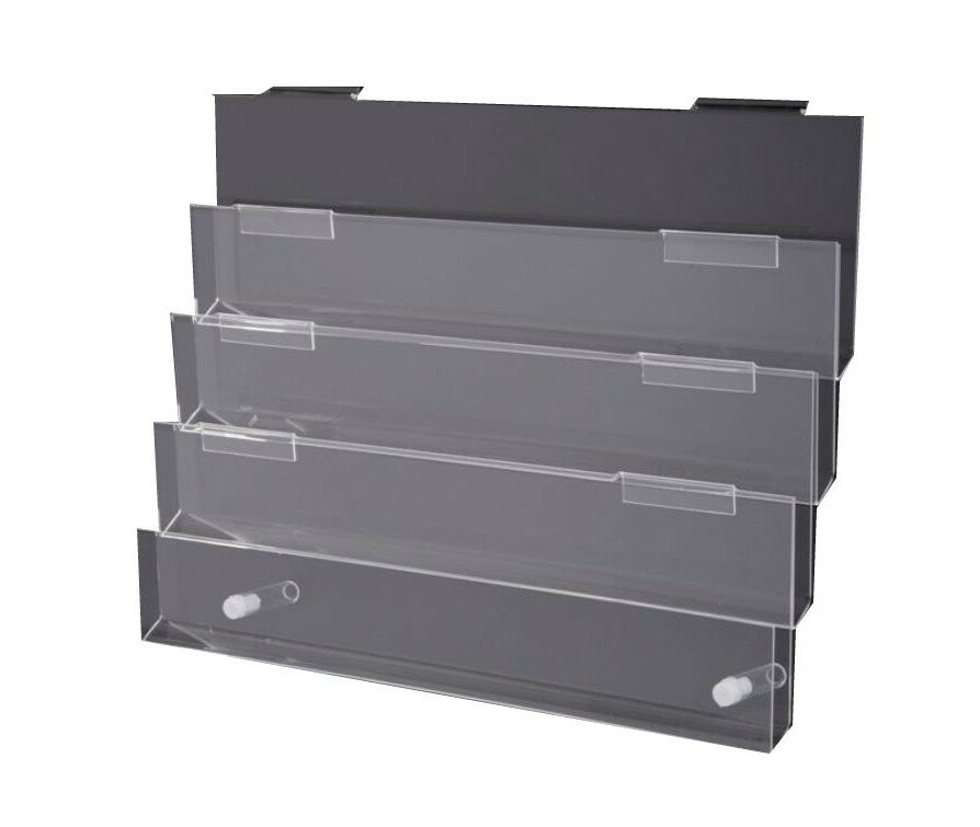 Standard Acrylic Accessories for the greeting card industry include single plastic card trays. Acrylic card trays are available in three standard lengths 600mm, 900mm and 1200mm but if you need a card tray in a specific length that is no problem as PAC also manufacture bespoke slatwall accessories. Other slatboard greeting card display options include our Multi Tier card tray, which are available in Two Tier, Three Tier or Four Tier options. The Two Tier Card Trays, Three Tier Card Trays or Four Tier Card Trays are available in three standard sizes but as with our single plastic card shelf if you require a specific length PAC can manufacture bespoke sizes.